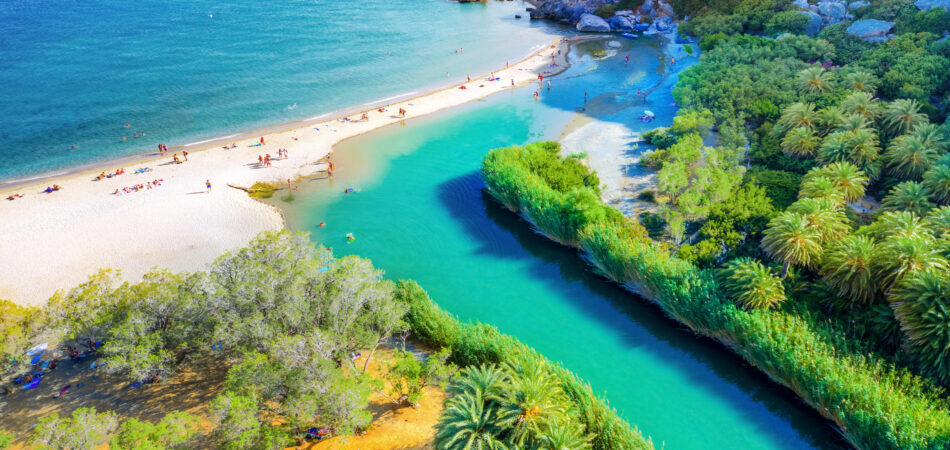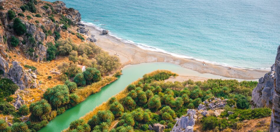 Lush Theophrastus palm trees grow along the riverbanks, creating a tropical atmosphere. This is the second largest palm forest in Crete, after Vai. The river forms a small lake about 500 meters long before flowing into the sea. You can walk along the river under the shade of the palm trees or explore the beautiful canyon. At the river’s exit, the beach has a mix of pebbles and sand, and on the eastern side, there is a rock shaped like a heart.